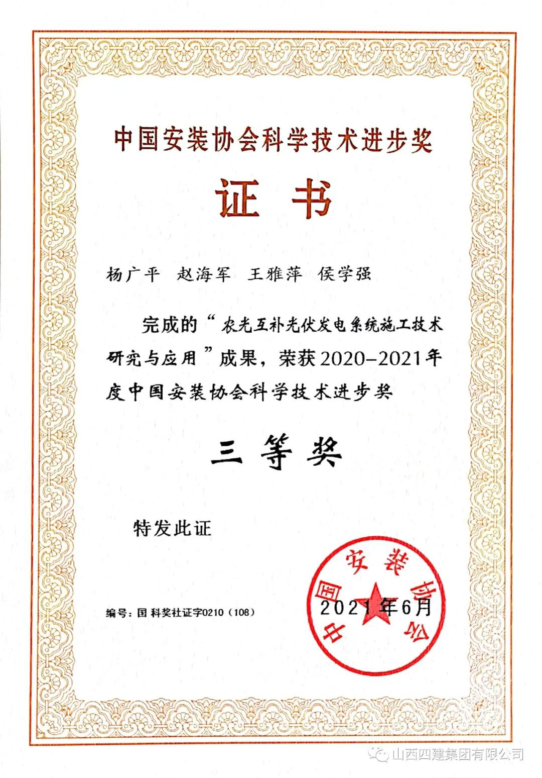 中国安装协会在南京组织召开2020~2021年度科学技术进步奖颁奖大会。山西贝斯特bst8888集团申报的《机电安装工程装配化施工成套技术研究应用》《农光互补光伏发电系统施工技术研究与应用》成果,荣获中国安装协会科学技术进步奖三等奖。