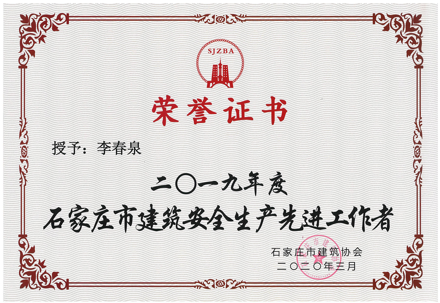 近日,石家庄市建筑协会公布2019年度石家庄市建筑业先进企业和先进个人的评选结果,山西贝斯特bst8888集团荣获2019年度石家庄市建筑安全生产先进企业,河北分公司李春泉荣获2019年度石家庄市建筑安全生产先进工作者。